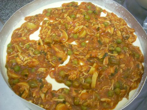 Distribua por cima o recheio, já morno para não cozinhar a massa.