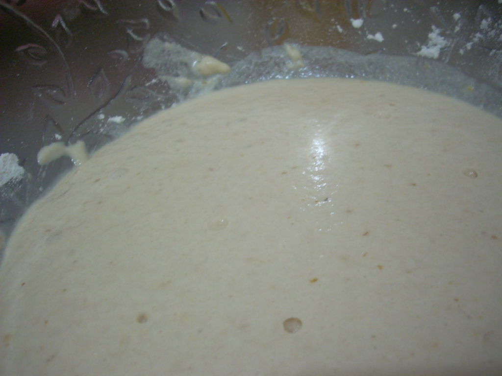 Após o tempo, o fermento reage e forma o que chamo de "esponjinha" (foto), então junte (já amassando): as farinhas já misturadas, o sal, os ovos batidos, a liga neutra, o óleo e o leite aos poucos até que dê ponto de amassar.