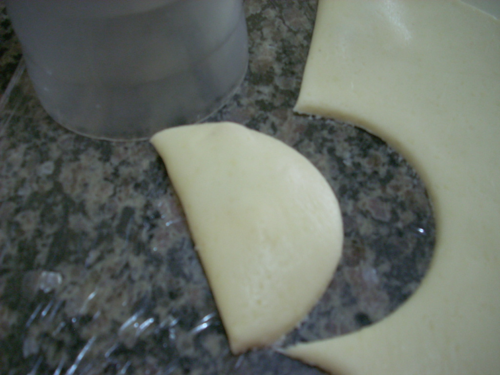 Os risoles eu fiz da mesma maneira que faço pastéis, abrindo com um rolo de massa, recheando com o creme de milho, o queijo e modelando com um copo.