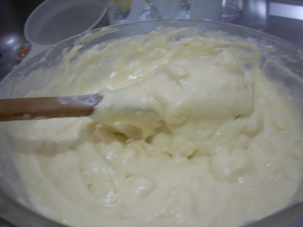 Peneire a farinha com o fermento em vasilha separada, e vá acrescentando à mistura aos poucos, batendo sempre.