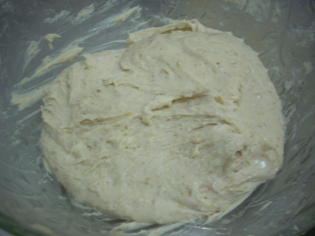 Após o tempo, o fermento reage e forma o que chamo de "esponjinha" (foto), então junte (já amassando):