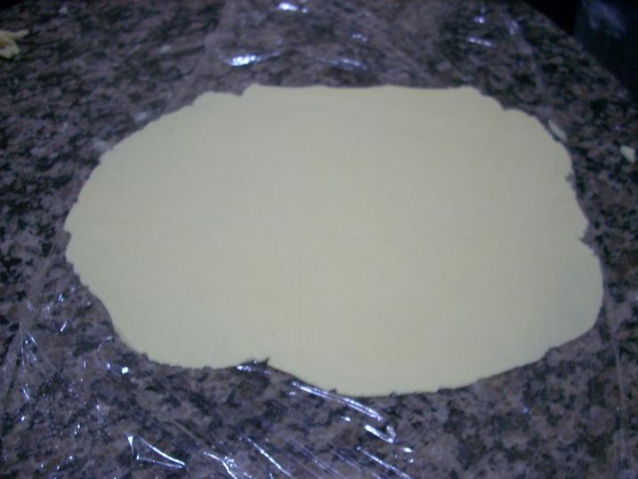 Prepare o recheio que desejar, estique filme plástico em uma bancada, abra a massa com um rolo na espessura de pastel (fino), recheie, dobre a massa.