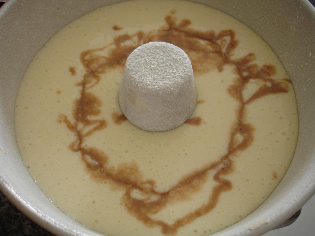 Coloque-a sobre a mistura de farinha e bata com a batedeira em velocidade baixa para misturar. Adicione os ovos, bata novamente em velocidade baixa. Adicione o fermento e continue batendo em velocidade baixa e em seguida aumente para velocidade máxima. Bata por 3 minutos.