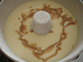 Distribua 2/3 da massa na assadeira untada e enfarinhada (uso a de furo no meio) e na parte que restar misture o chocolate.